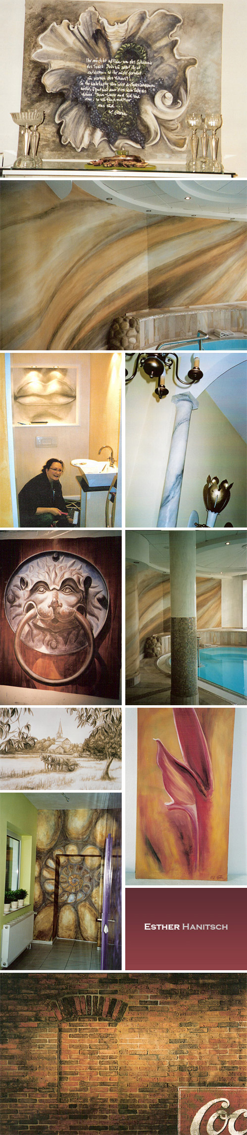 Esther Hanitsch, ist ausgebildete Theatermalerin und Lithografin. Sie malt nach Kundenwunsch, nach eigenen oder Kundenentwürfen. Besonders wichtig ist ihr, individuelle Lösungen anzubieten, die genau zu den jeweiligen Menschen und Umgebungen passen. Alle Bemalungen und Bilder sind mit hochwertigen Pigmentfarben gemalt, die farb- als auch lichtecht sind. Bilder können auf Wunsch in allen Größen hergestellt werden und werden auf robuster Baumwoll-Nessel-Faser gemalt. Andere Untergründe/Stoffe sind auch erhältlich. Preise auf Anfrage und nach Absprache.